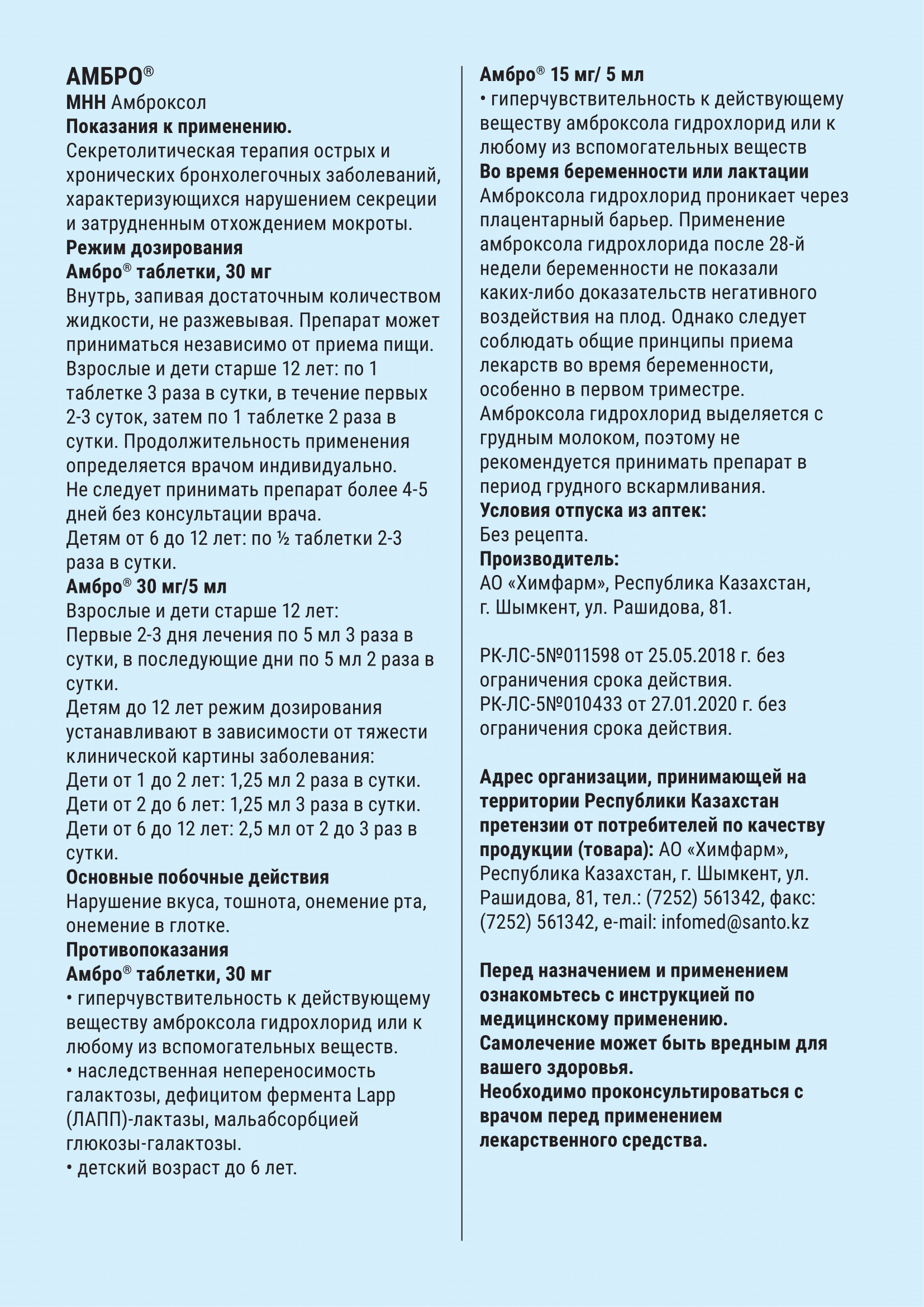 Поскольку риск бронхоспастических реакций в основном связан с вдыханием, Амбро 7.5 мг/мл, раствор для приема внутрь и ингаляций, не должен использоваться у пациентов с известной бронхиальной гиперактивностью и/или атопией в анамнезе.